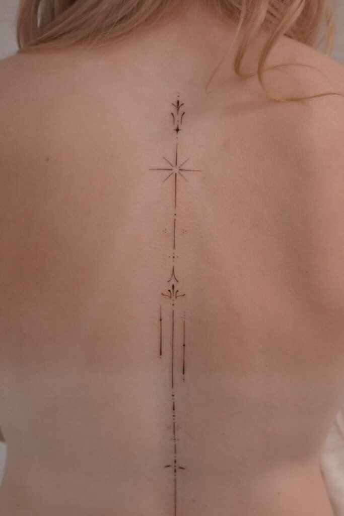 This ultra-minimalist spine tattoo by __elleink features fine geometric lines and a guiding star, giving it a celestial and directional feel.