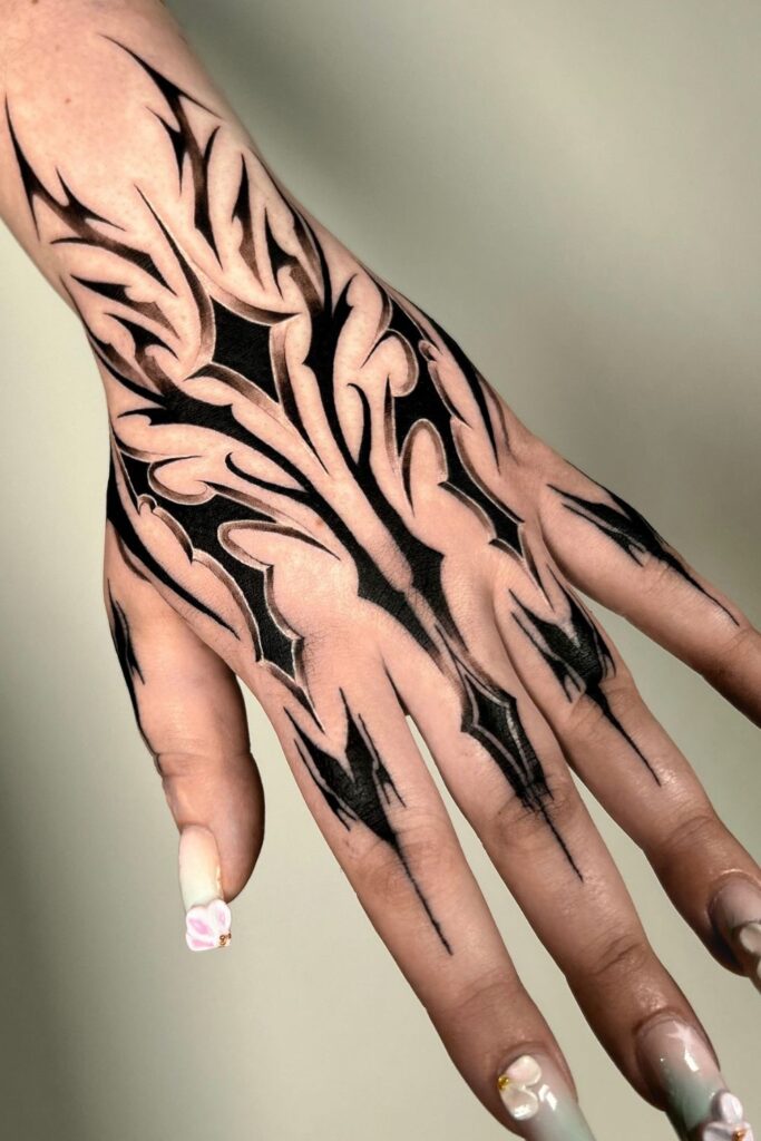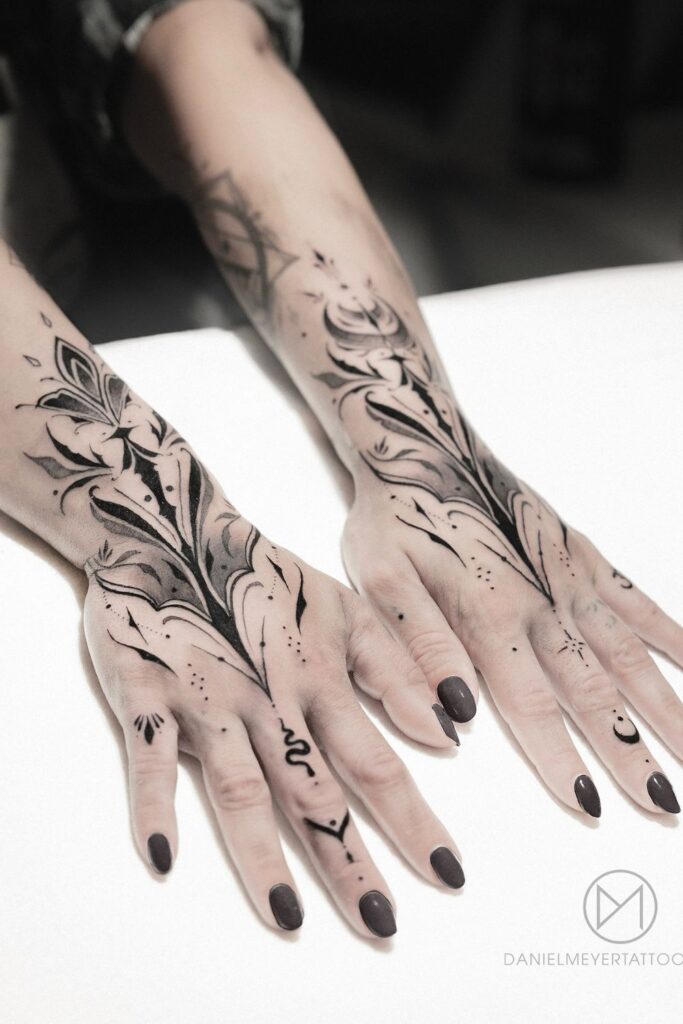 A stunning option among dark hand tattoos women love for its texture and mystery.