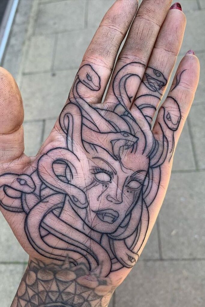 This linework tattoo of Medusa on the palm channels feminine rage, power, and protection.
