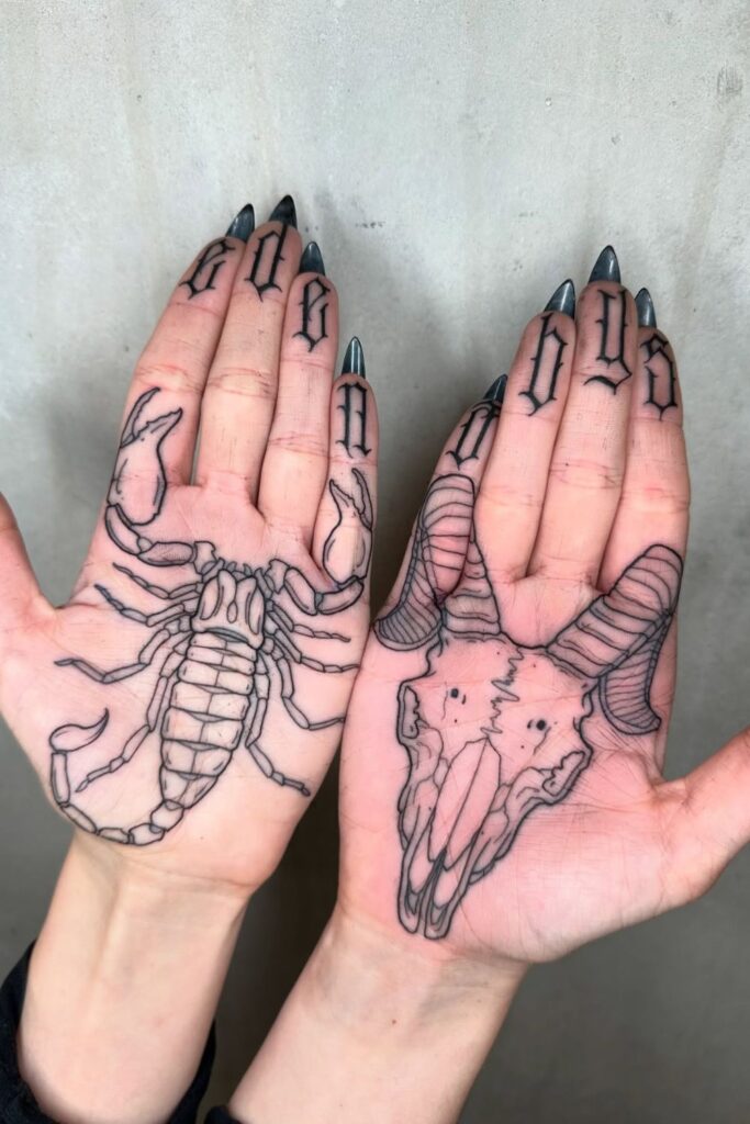 From goat skulls to scorpion outlines, these palm pieces scream bold rebellion.