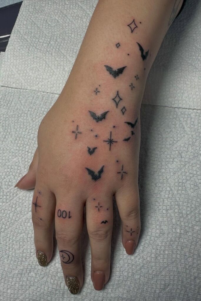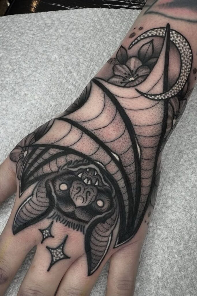 These bat hand tattoos for women blend mystery, magic, and transformation.