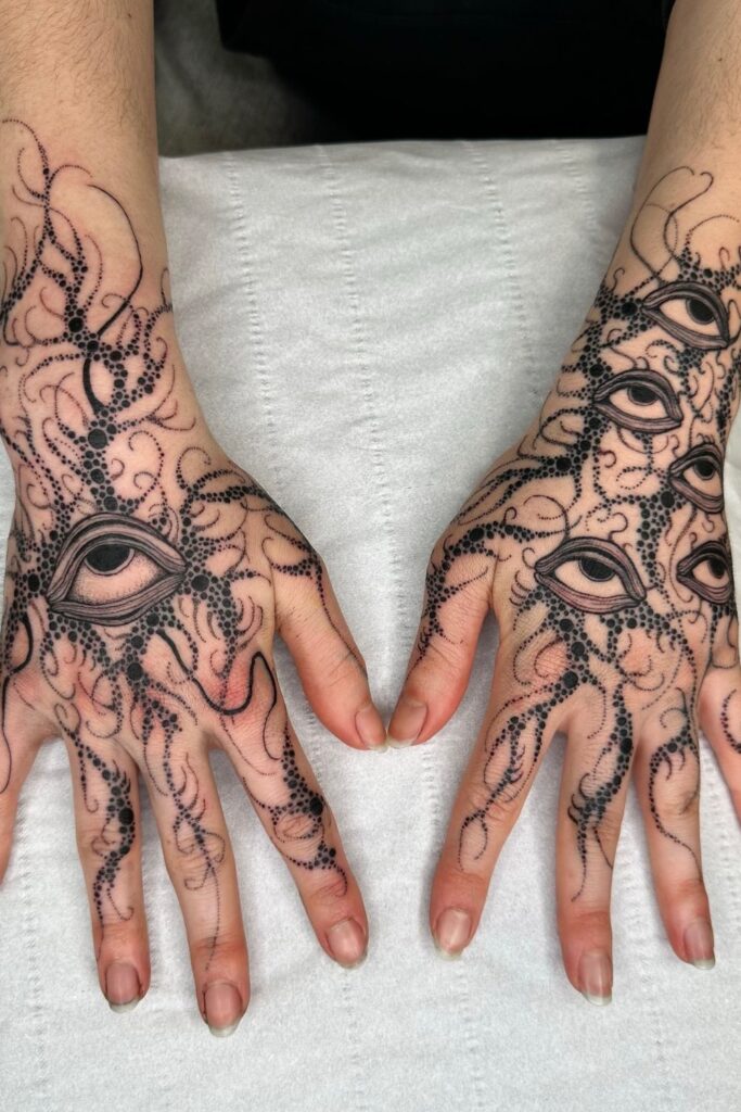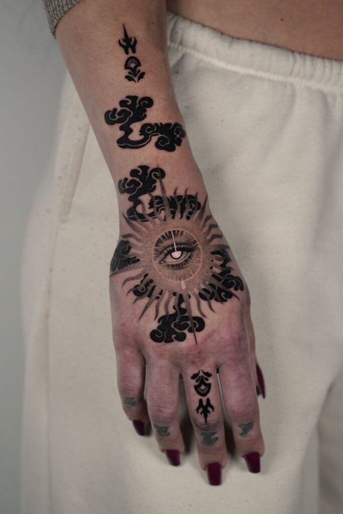 A striking witchy hand tattoosymbolizing intuition, connection, and hidden strength.