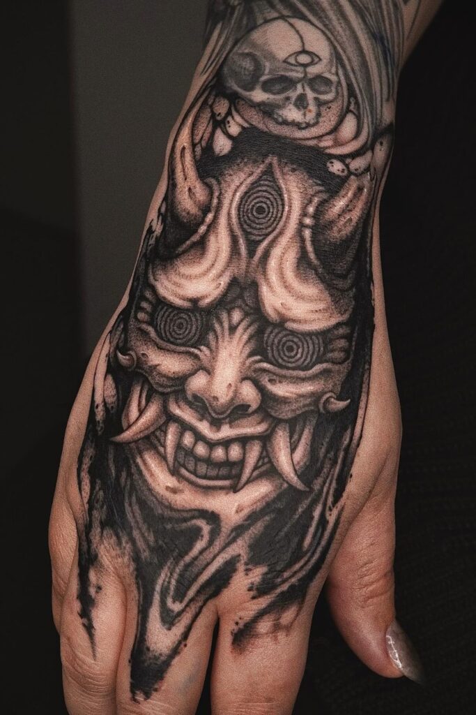 This intense hand tattoo features a demonic mask with hypnotic eyes and sharp teeth, symbolizing protection, fearlessness, and power.