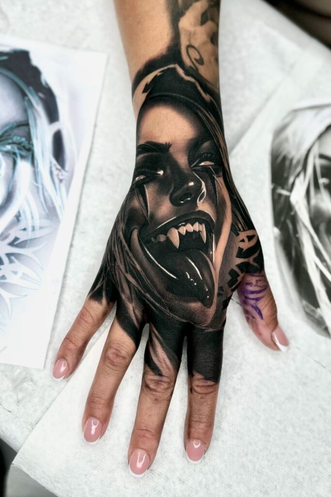 This hyper-realistic face with vampire fangs brings dark hand tattoos women to another level.
