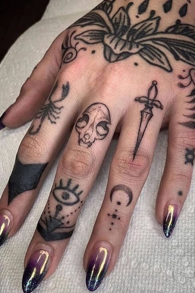 Touch-ups may be needed over time, especially for intricate witchy finger tattoos or bold goth finger tattoos for women, since hand ink can fade faster than tattoos on other parts of the body.