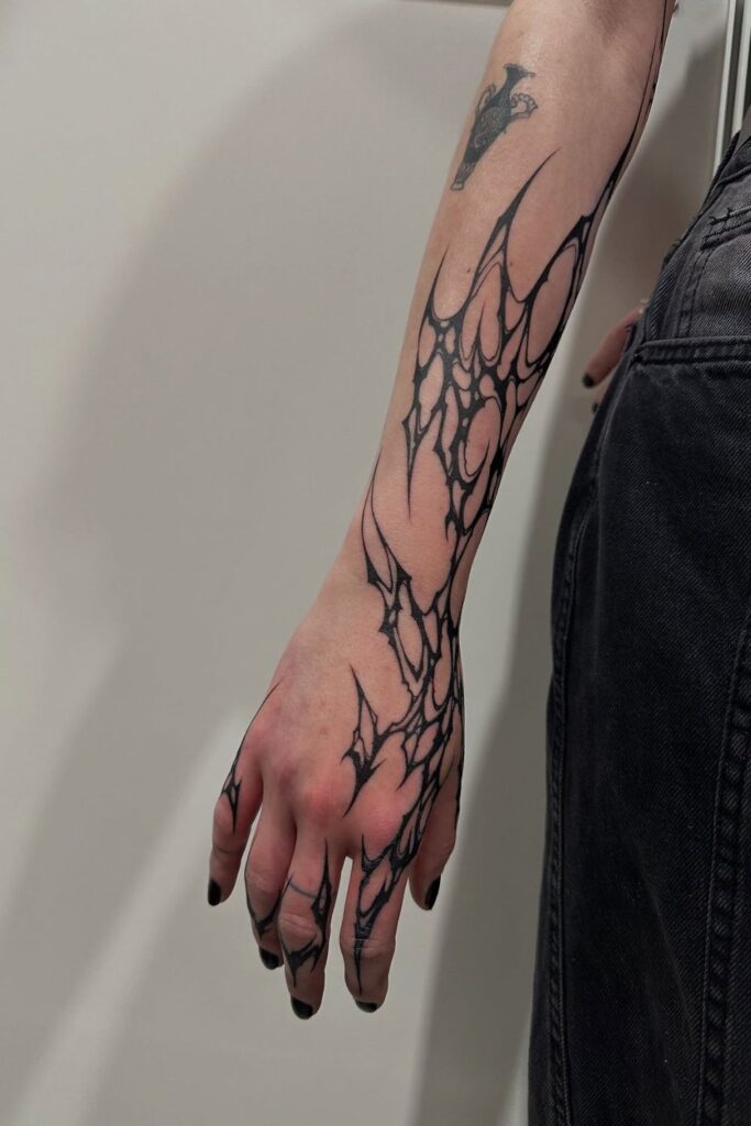 This long, spidery pattern flows from arm to fingers, like a spell crawling down the skin.