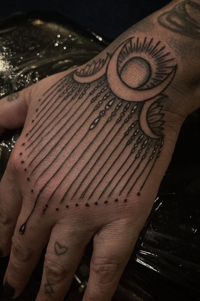 This elegant witchy hand tattoo features a radiant crescent moon with cascading lines and drops, symbolizing intuition, cycles, and feminine energy.