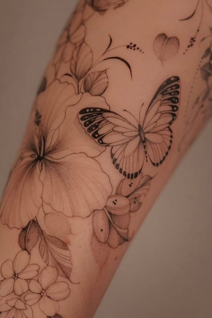 A butterfly tattoo captures nature s beauty and femininity, often featuring wildflowers, lilies, or cherry blossoms alongside delicate wings.