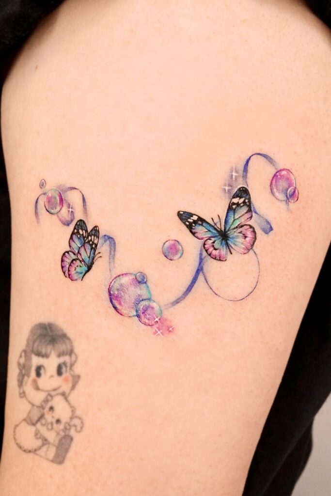 Colorful butterfly tattoos: These designs are soft, fluid, and expressive, like wearable art. The splashes of color make each piece unique.