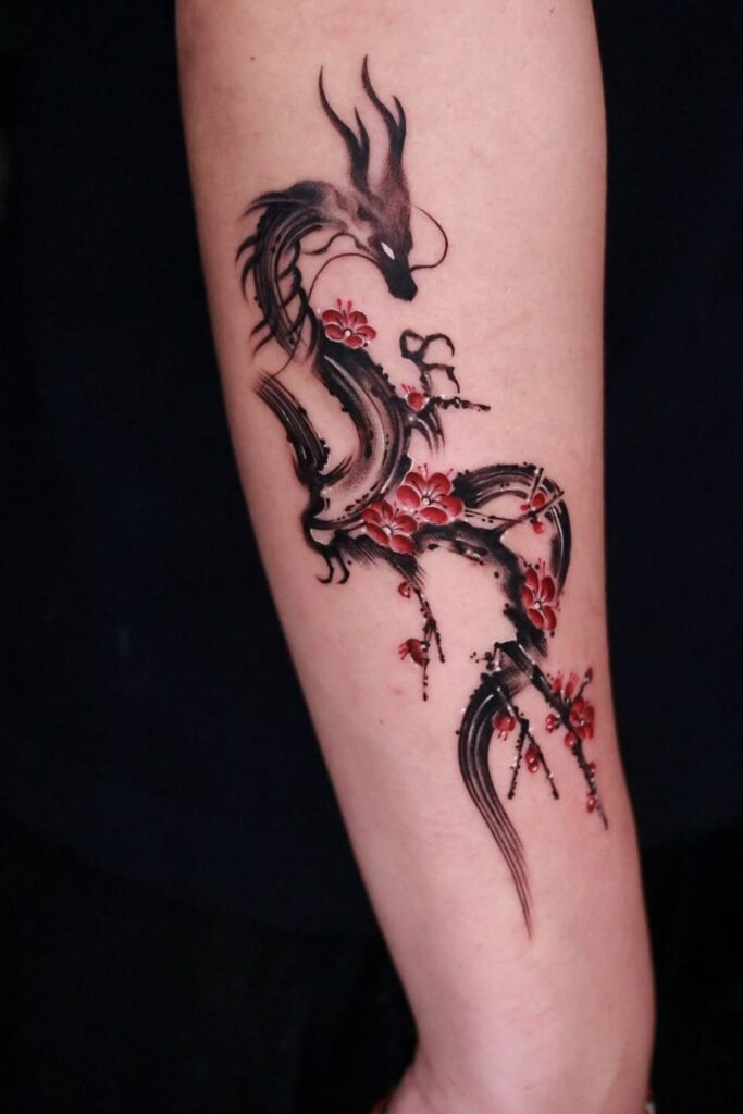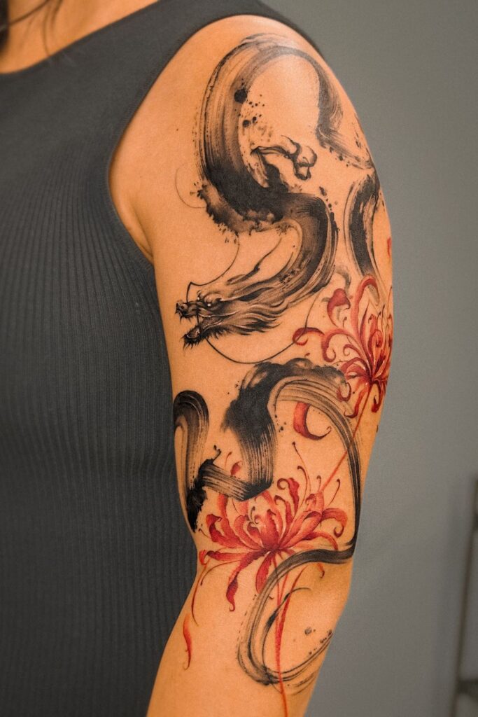Ink Brush Dragon Tattoo With Red Flowers – A Bold and Artistic Statement