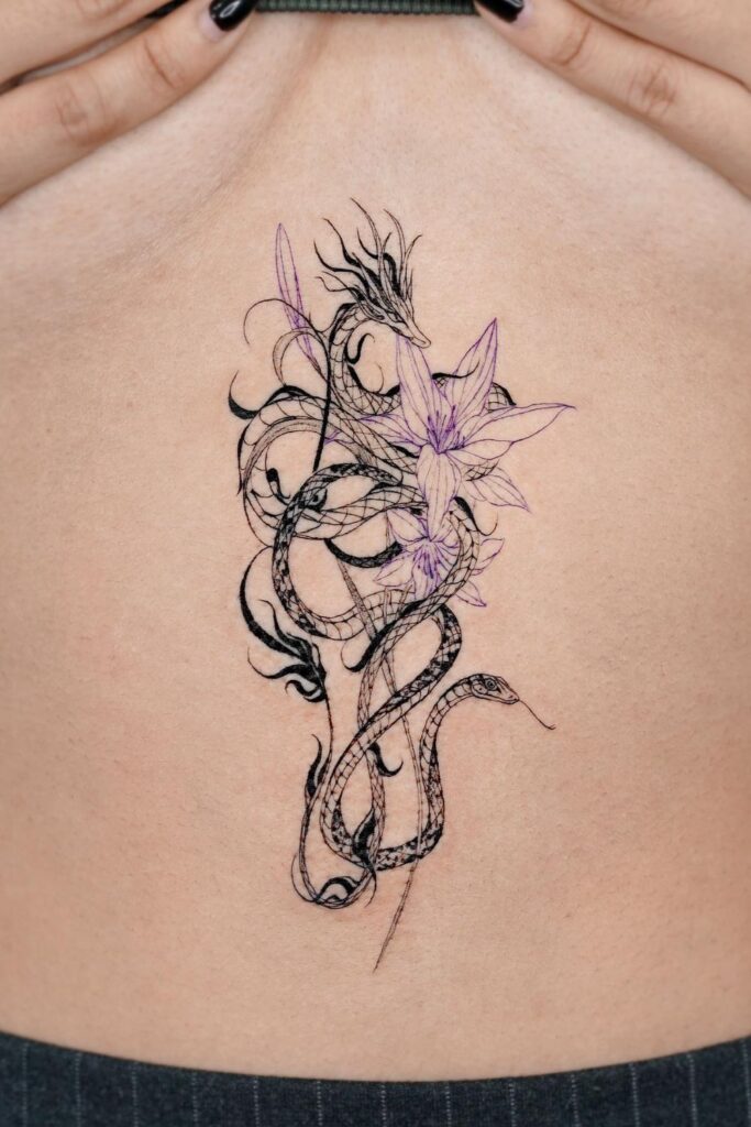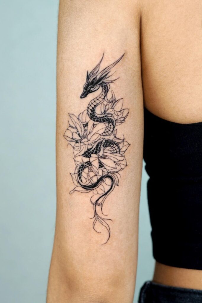 This feminine dragon tattoo for women is perfect for anyone who prefers a sleek, understated dragon flower tattoo design that still holds deep symbolism.