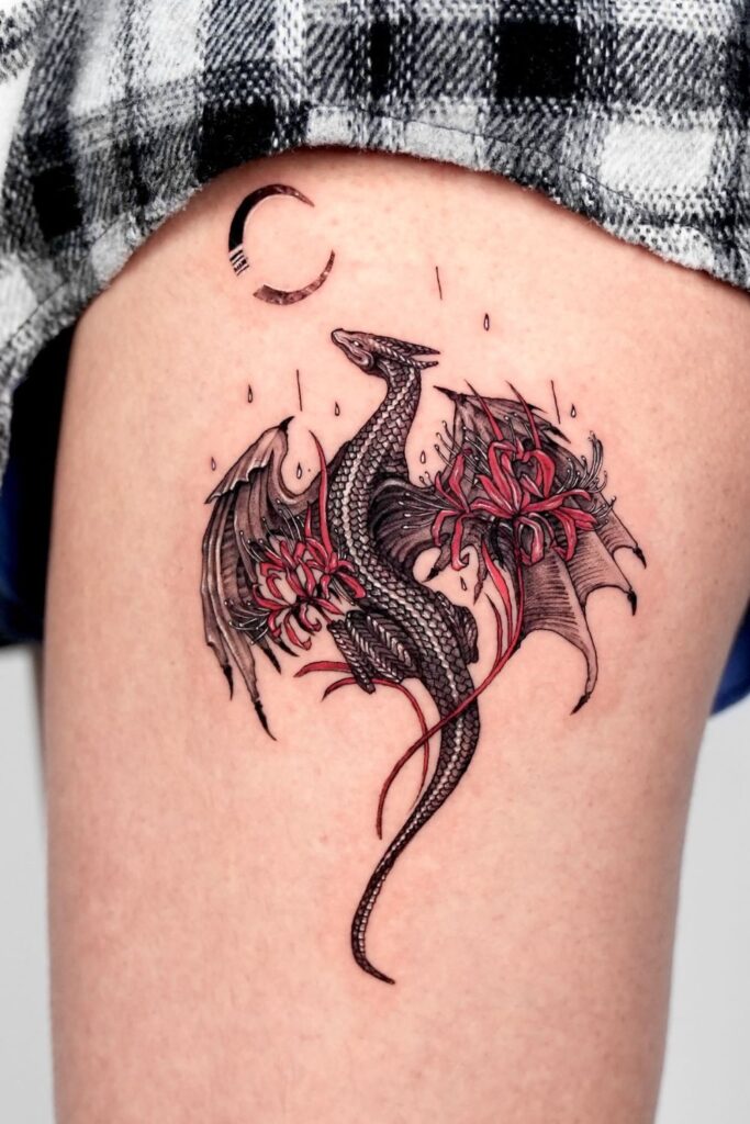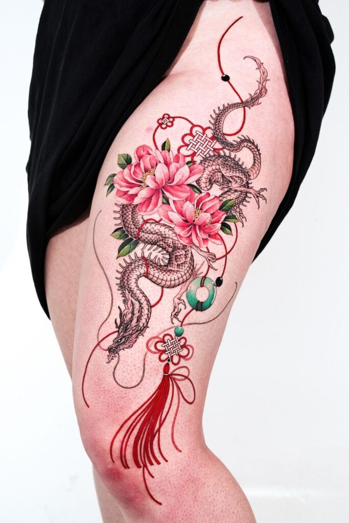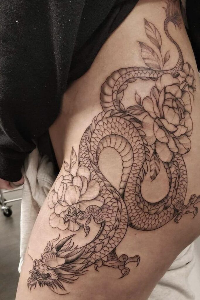 This dragon with flowers tattoo design is perfect for those who want a thigh tattoo that is both feminine and fierce, embodying the balance of strength and delicacy in their journey through life.