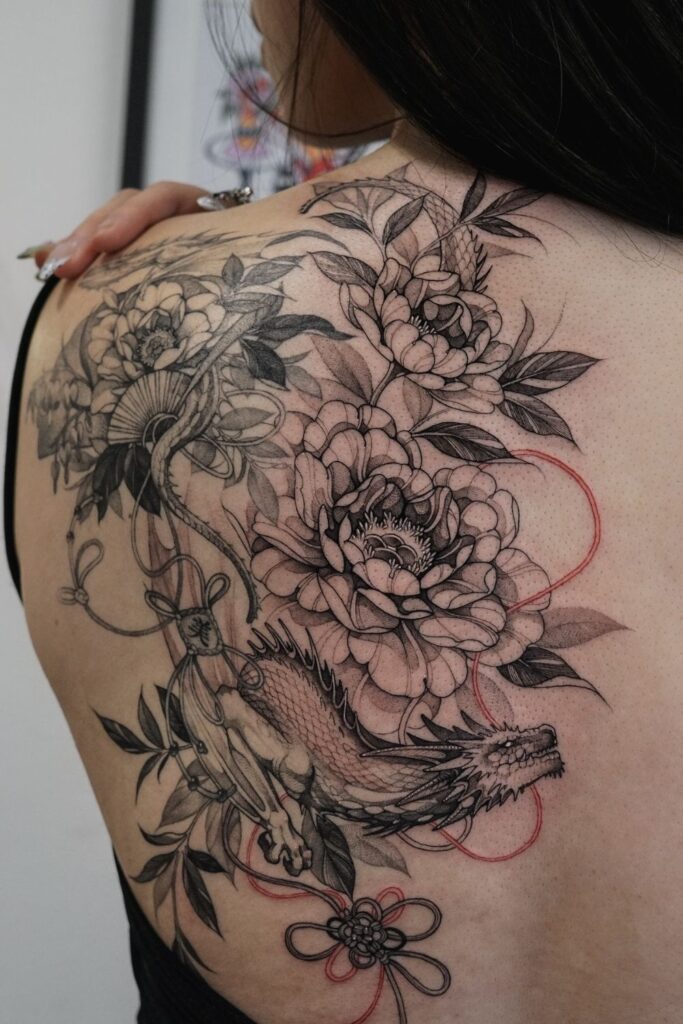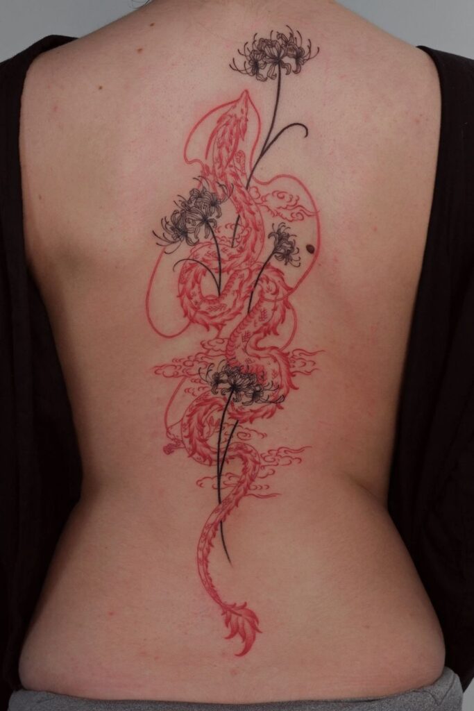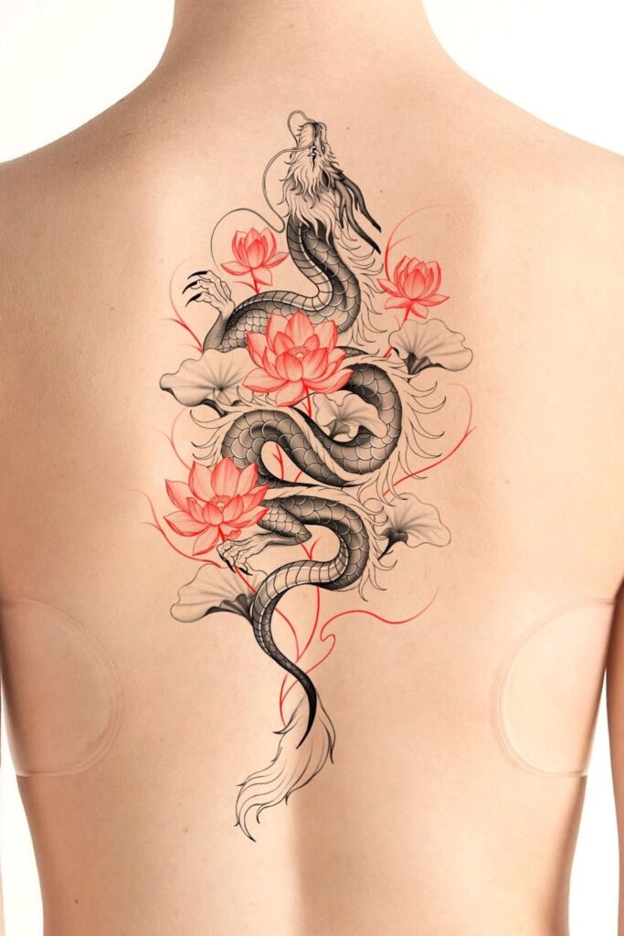 Red Lotus and Dragon Back Tattoo – A Bold and Feminine Statement