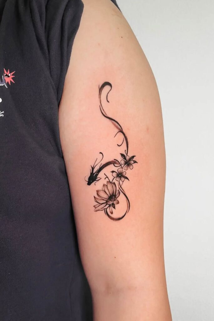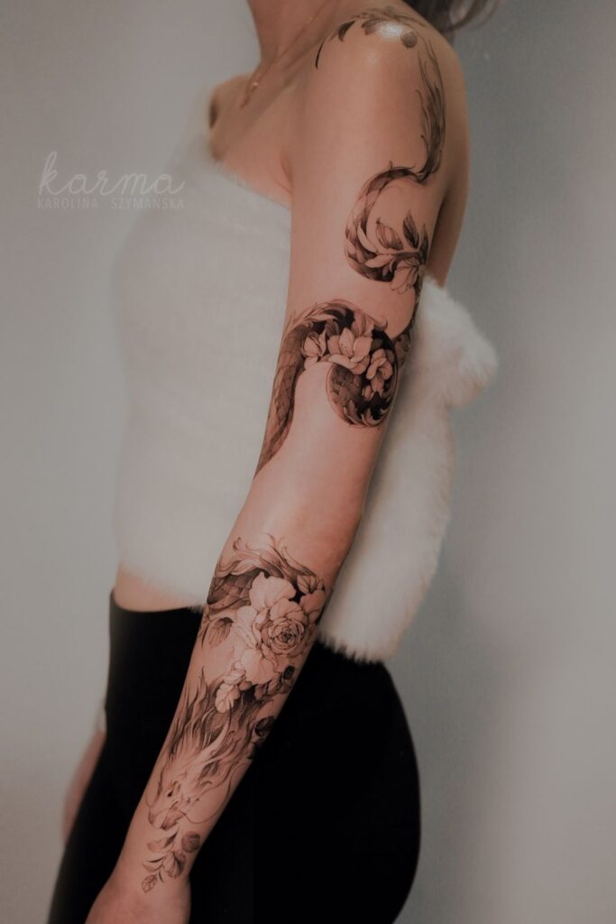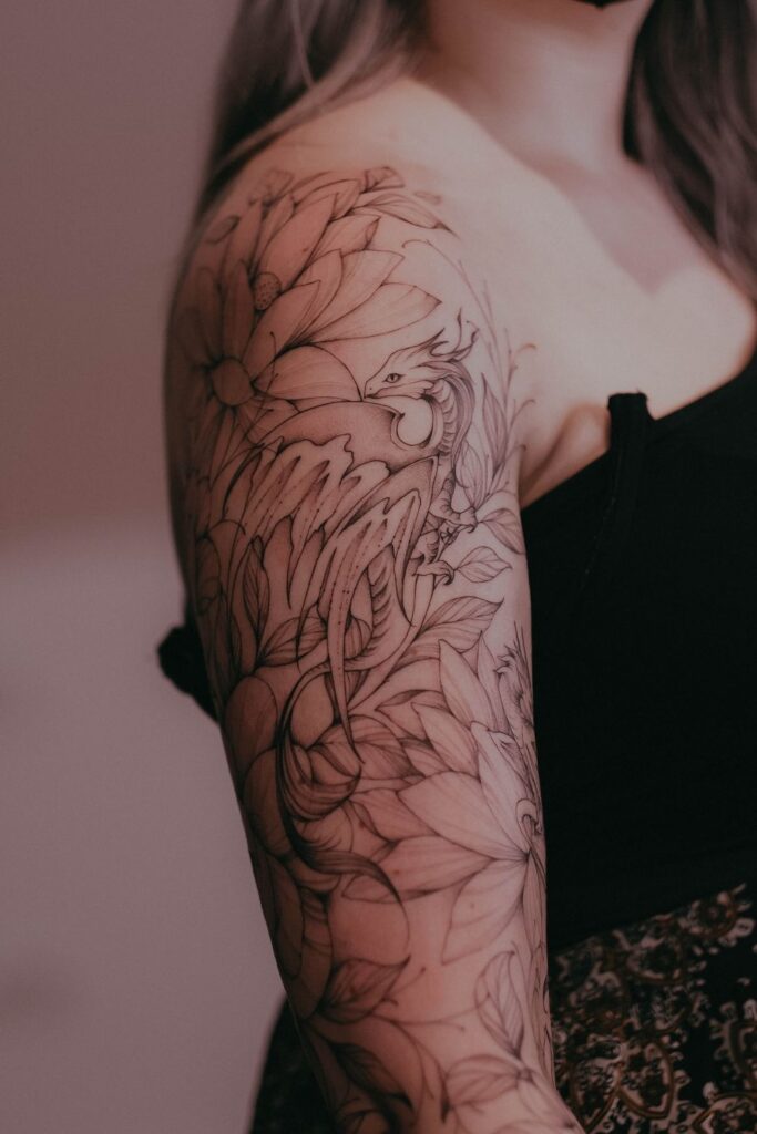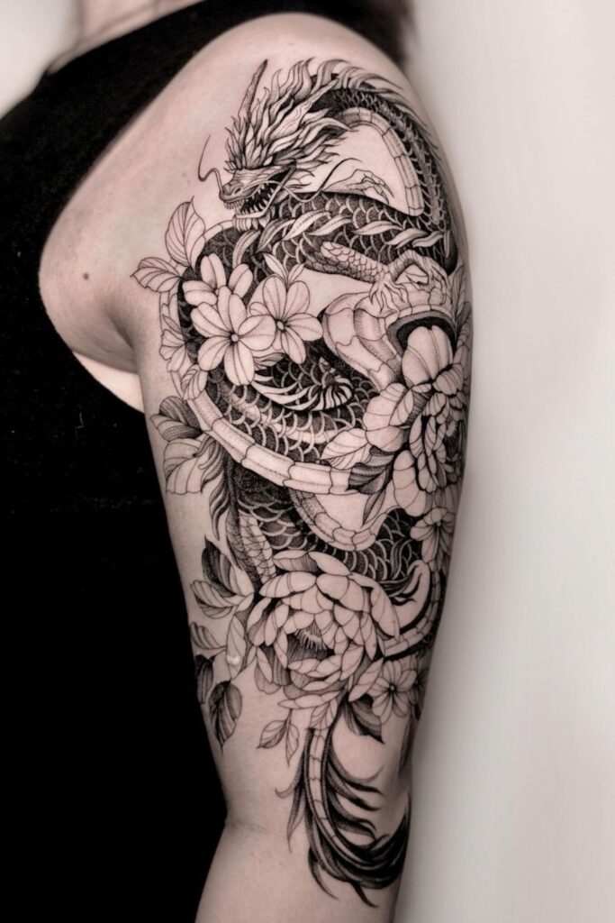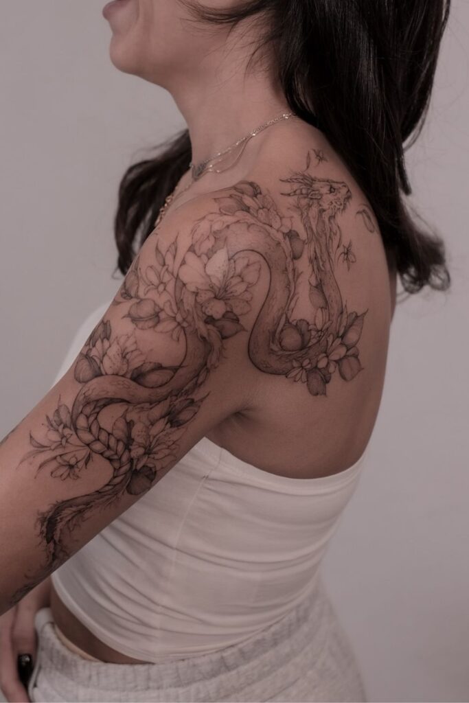 Floral Dragon Shoulder and Arm Tattoo – A Symbol of Feminine Power