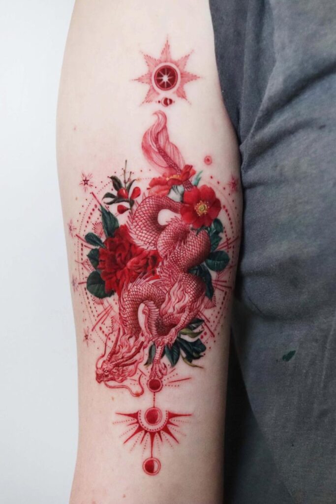 This dragon tattoo with red flowers by xingalmond is a delicate yet striking design that blends the fluidity of the dragon with the boldness of chrysanthemum flowers.