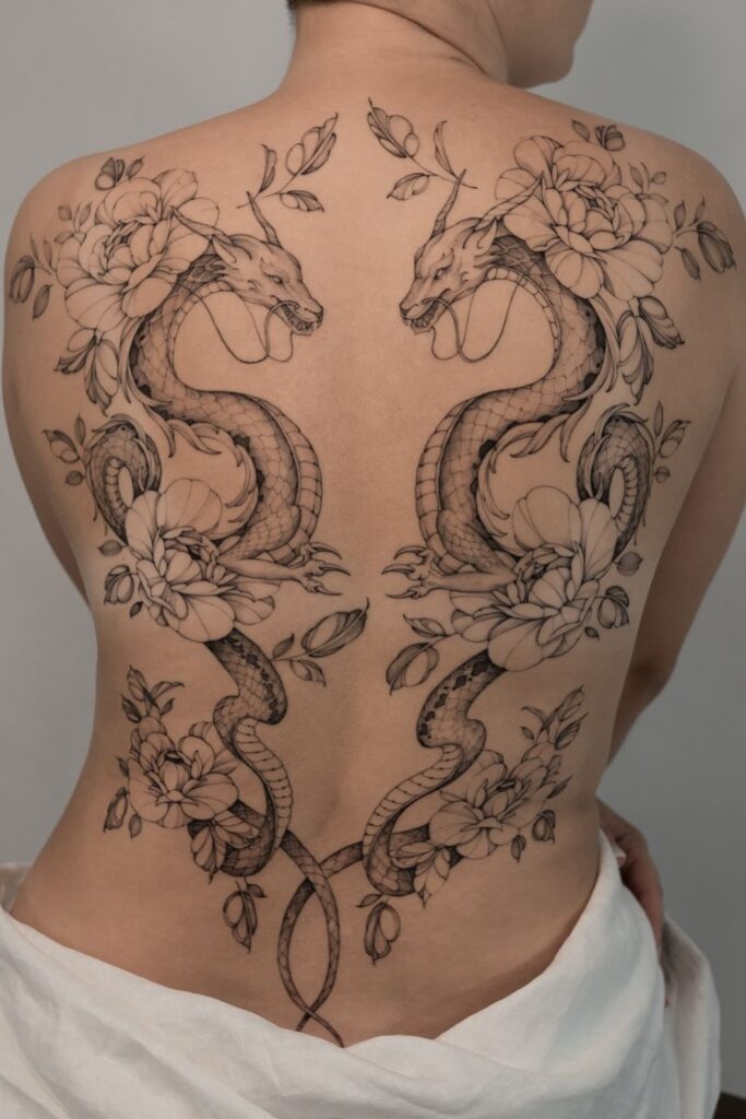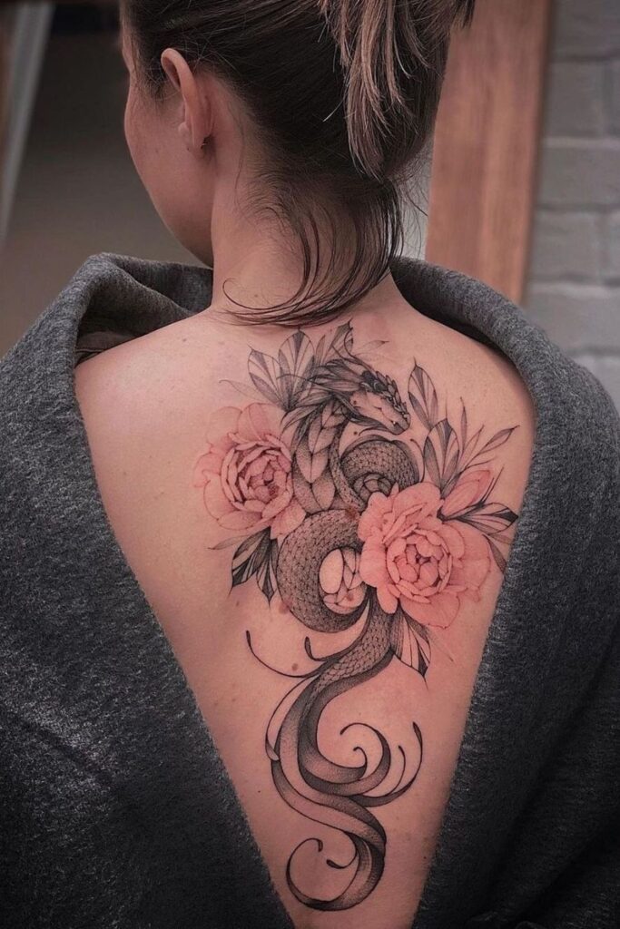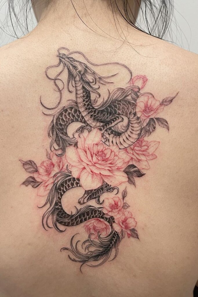 Delicate Back Floral Dragon Tattoo – A Feminine and Artistic Expression