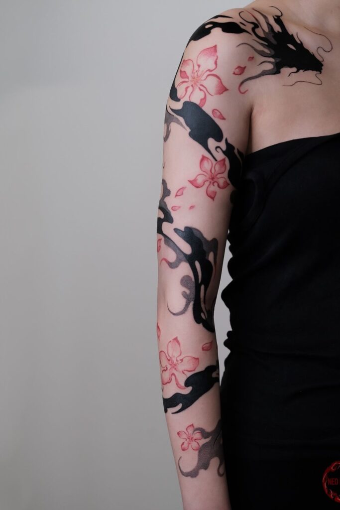 This full-arm dragon with flowers tattoo design by neonguyen merges black ink abstraction with striking red floral details.