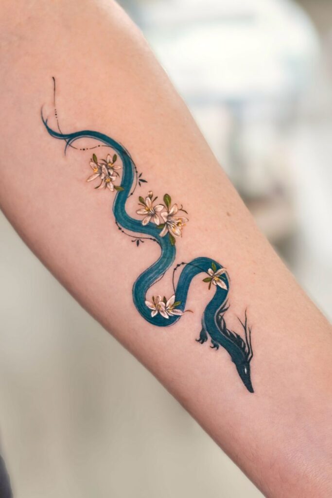 The deep blue dragon contrasts beautifully with light floral details, making this dragon and flower tattoo for women’s arm an excellent option for those who want a fluid, magical tattoo.