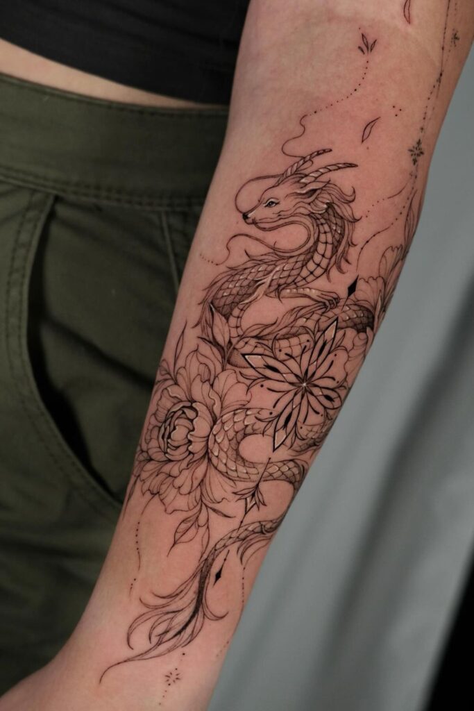 This dragon flower tattoo design by inlove.tattooer wraps beautifully around the arm, featuring intricate floral details that enhance the mythical dragon’s presence.