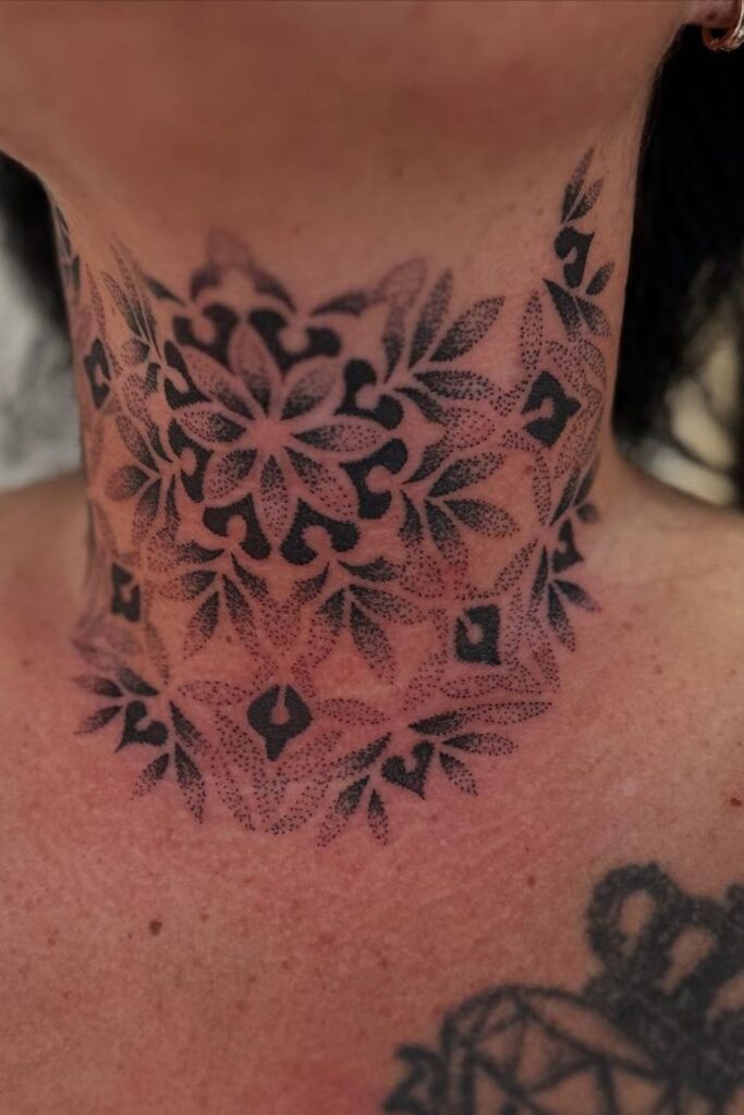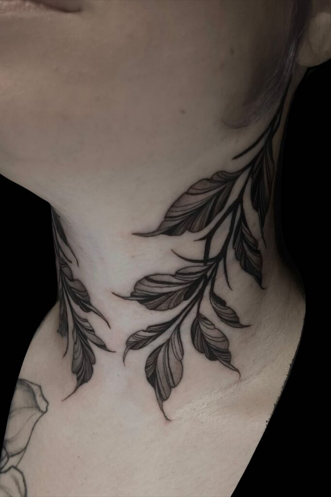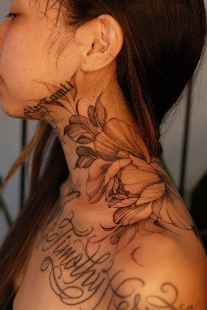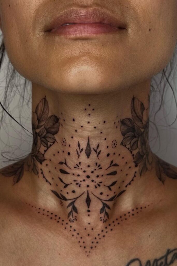 Full neck tattoos for women can incorporate detailed shading or symmetry to create a striking piece of art that defines your entire aesthetic.