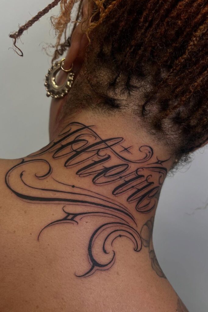 Name tattoos on neck for women are equally meaningful, often showcasing the names of children, loved ones, or inspirational words that hold deep emotional value.