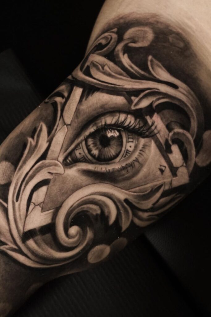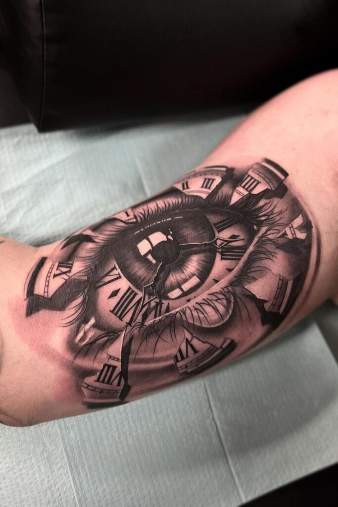 Combining surrealism and symbolism, this tattoo features a realistic eye intertwined with a clock.