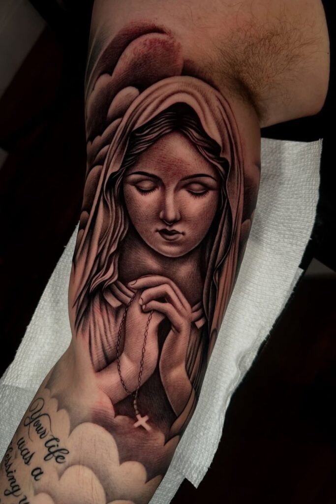 A serene depiction of the Virgin Mary, this tattoo radiates peace and spirituality.