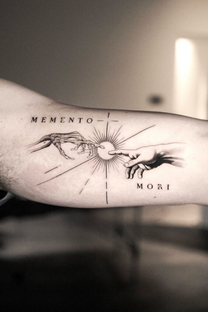 A minimalist yet profound design, this tattoo features the phrase “Memento Mori” paired with hands symbolizing life and mortality.