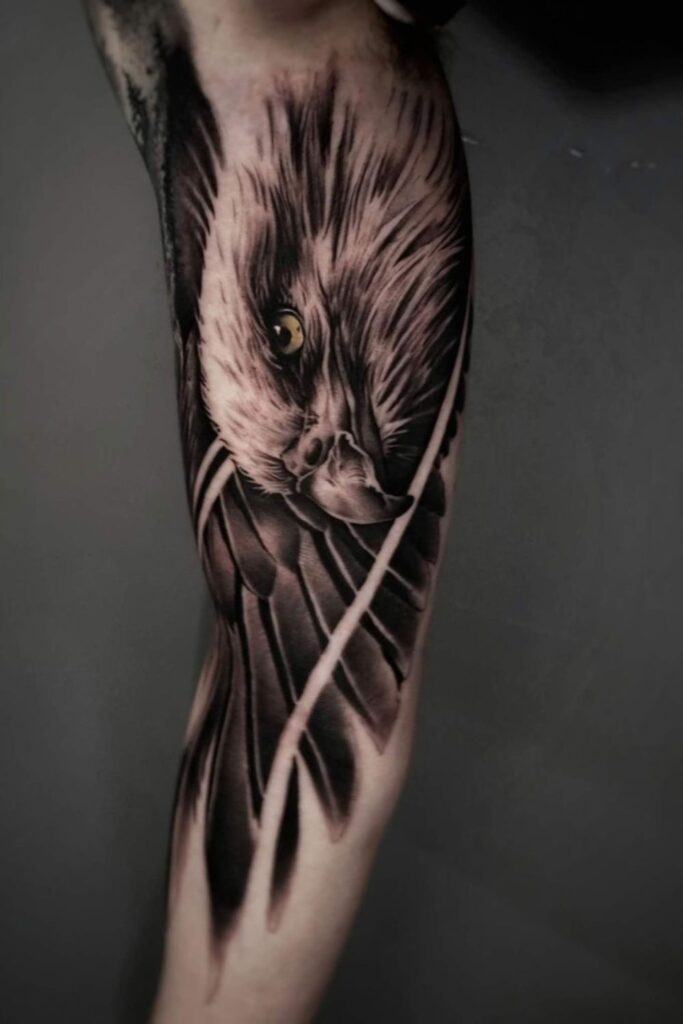 Featuring the sharp detail of an eagle s feathers, this tattoo is a tribute to freedom and strength.