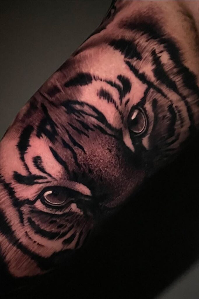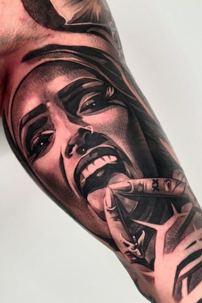 A bold and intense design, this tattoo captures raw emotion with striking contrast and sharp details.
