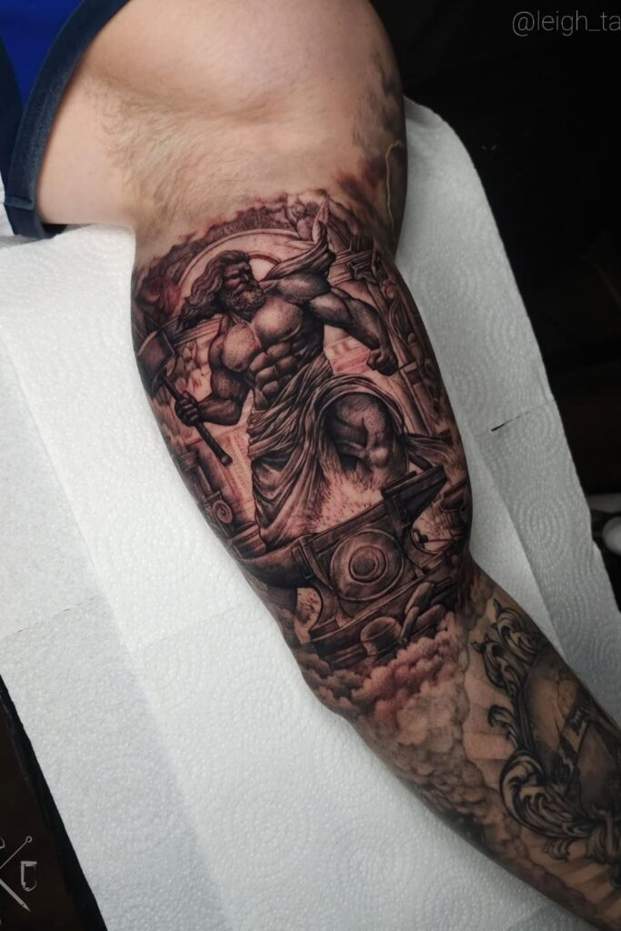 This masterful tattoo portrays a Greek god, likely Hephaestus, working at his forge, a symbol of craftsmanship, resilience, and creation.