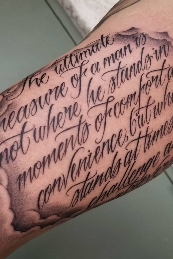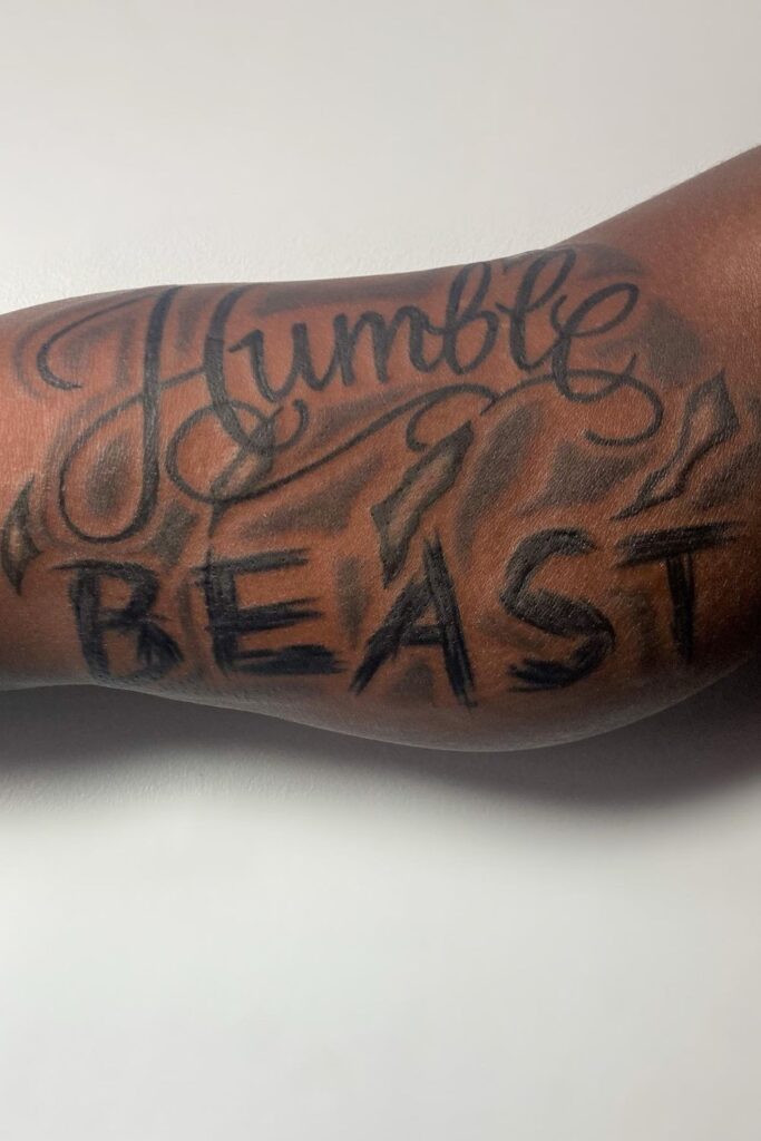 Combining bold typography with a reflective phrase, this tattoo suits someone who embraces duality, humility and power.