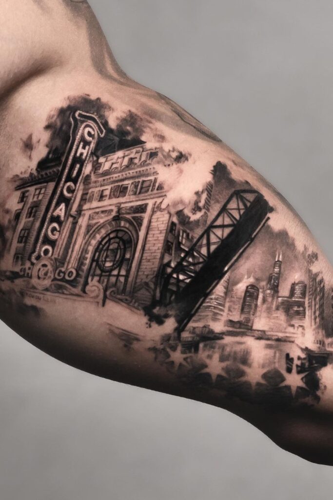 This intricate tattoo features iconic Chicago landmarks, ideal for someone with deep ties to the Windy City.