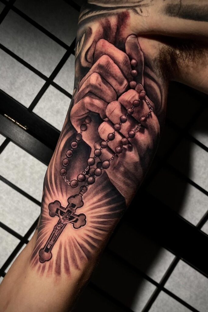 A deeply meaningful piece, this tattoo showcases hands holding a rosary, symbolizing prayer, faith, and devotion.