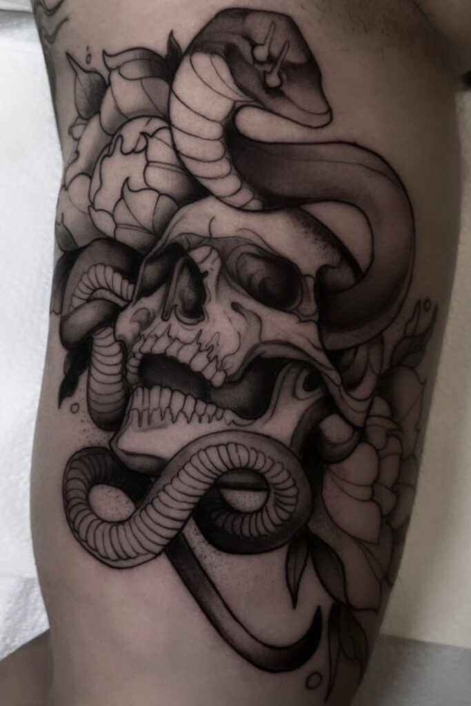This tattoo intertwines a menacing snake coiled through a decayed skull, creating a striking balance of life and mortality.