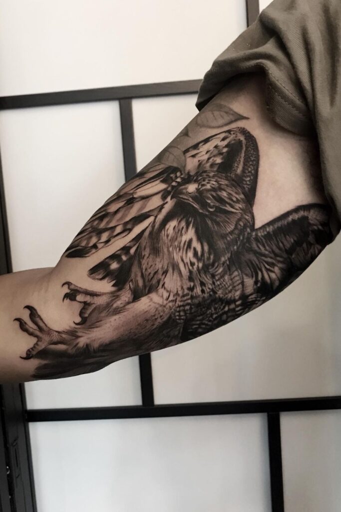 Capturing a hawk mid-flight, this tattoo is full of dynamic energy and power.