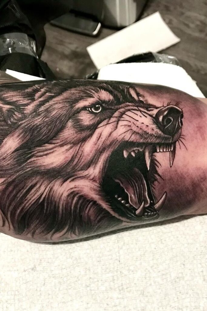 This lifelike wolf tattoo captures the animal’s piercing gaze and commanding presence.