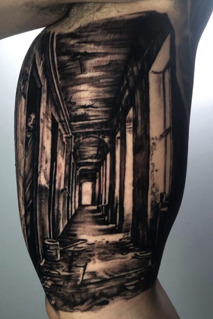 This eerie design captures a shadowy hallway with incredible depth and detail, complete with haunting figures lurking in the shadows.