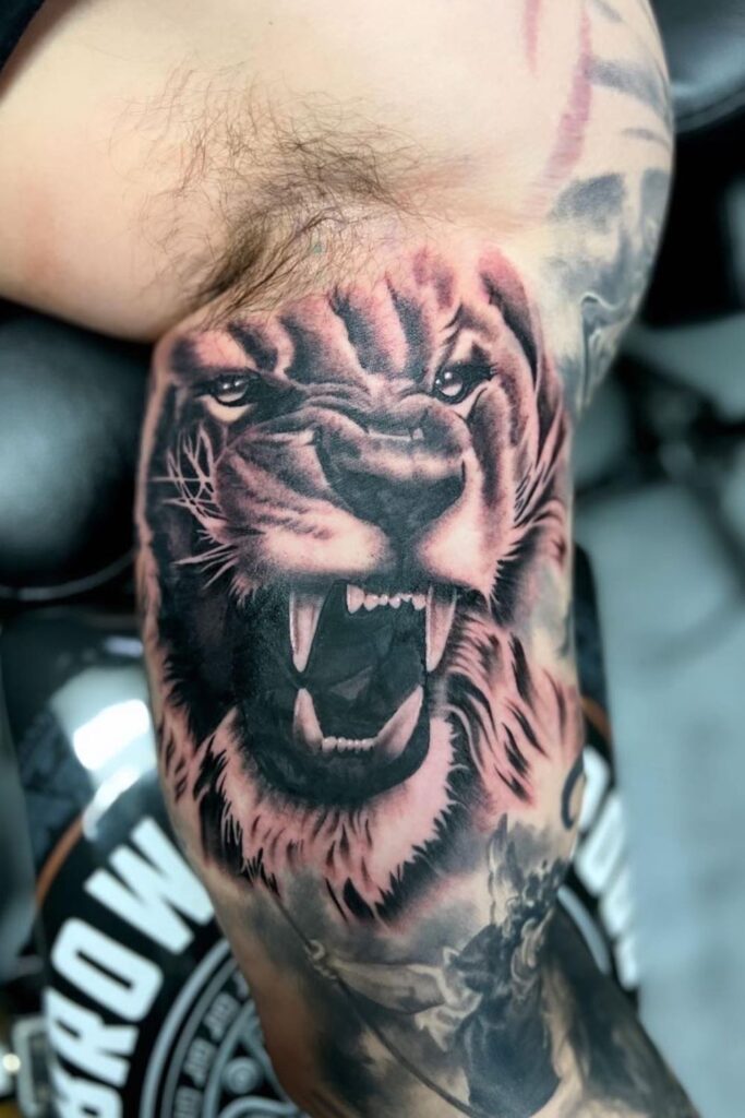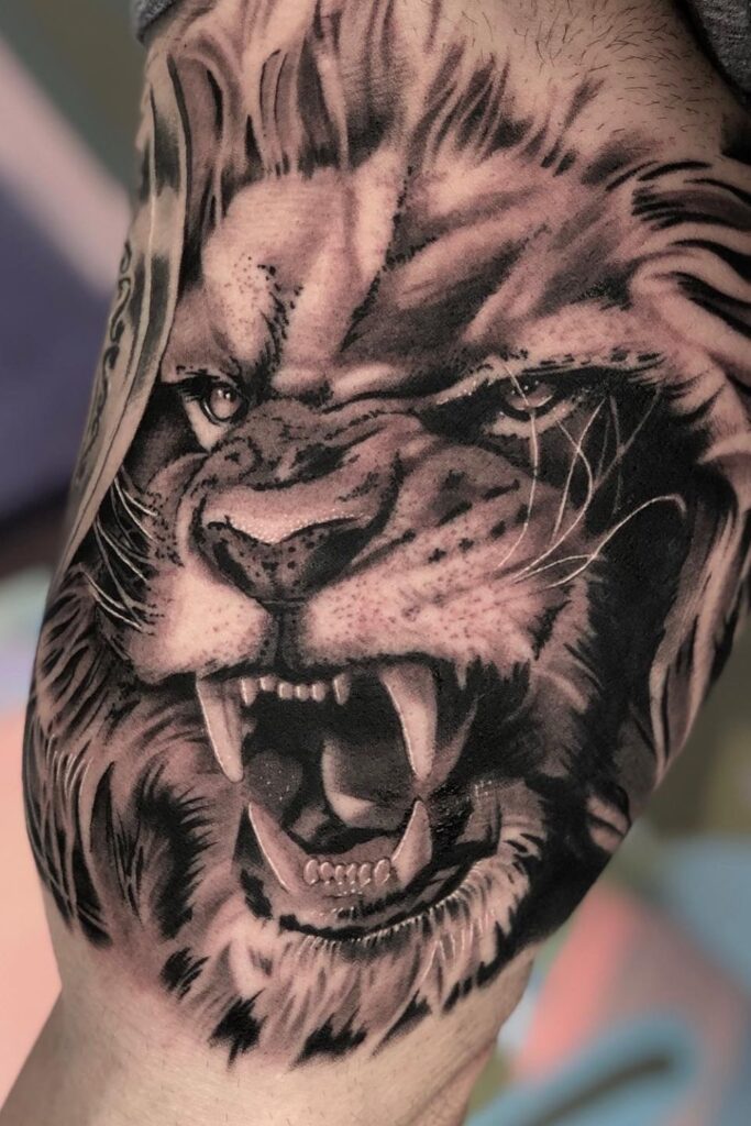 This lion tattoo captures raw emotion and power, making it an excellent choice for someone seeking to showcase strength and leadership.