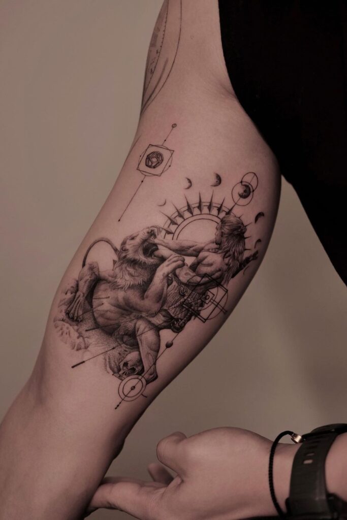 This tattoo blends the raw power of a lion with the precision of geometric elements and celestial motifs.