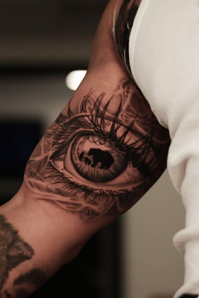 This stunning tattoo combines the realism of a detailed eye with a silhouette of a bear and cub within, creating a powerful narrative of protection and family.