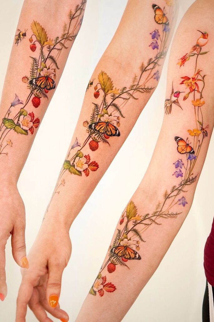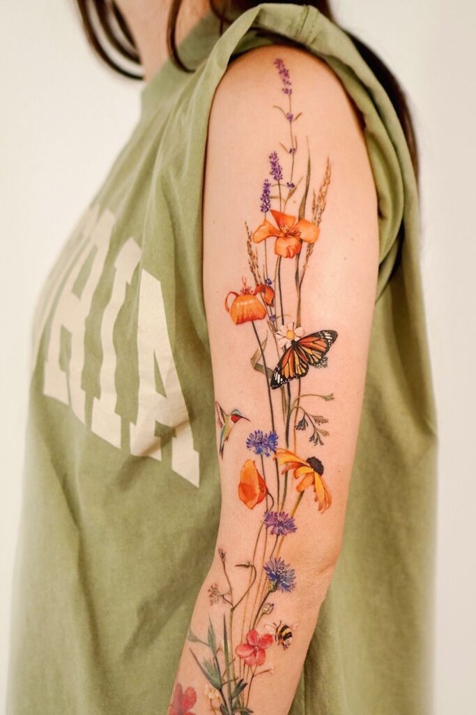 A stunningly delicate tattoo by “abii_tattoo” featuring vibrant wildflowers, a monarch butterfly, and a hummingbird, this piece captures the beauty of life s fleeting yet meaningful moments.