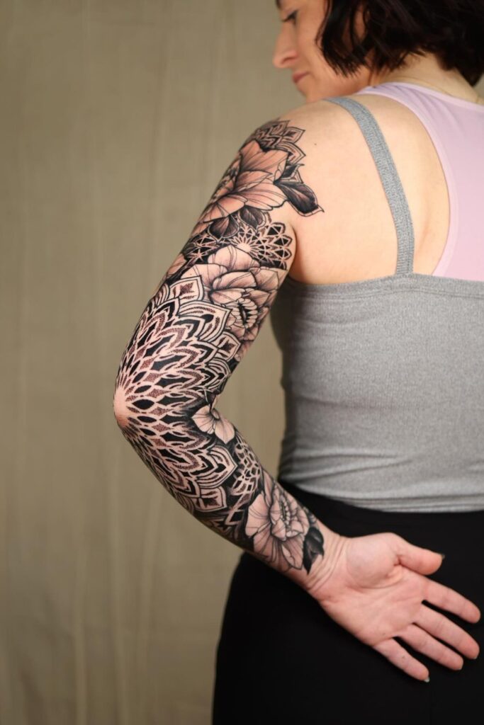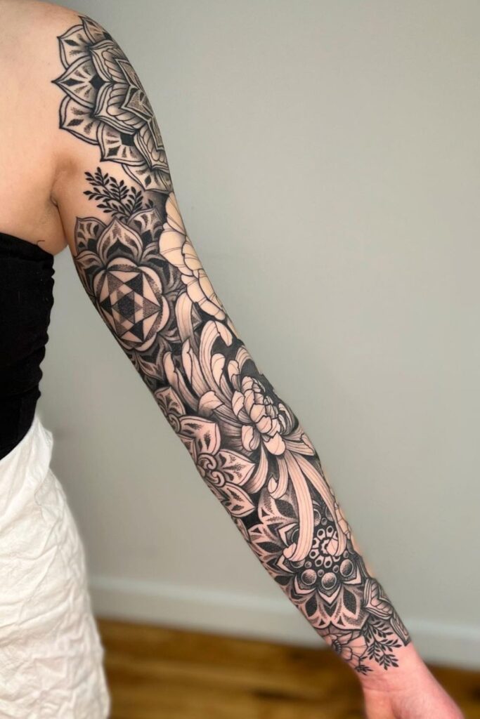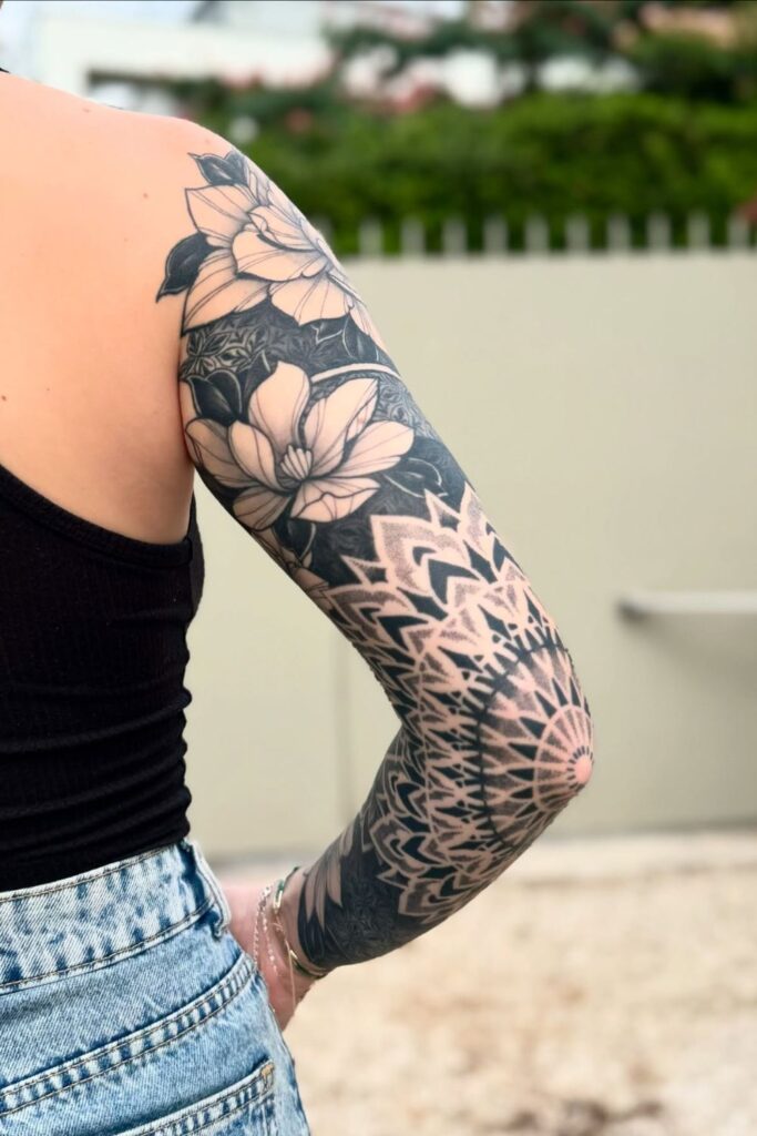 This floral and mandala-inspired arm sleeve tattoo by “fleur.tattoos” blends bold linework with intricate details, creating a mesmerizing effect.