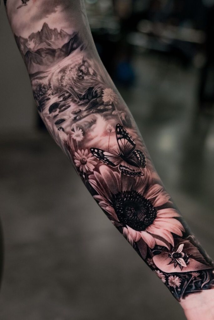 This hyper-realistic sleeve tattoo by “quinhernandez” beautifully merges sunflowers, butterflies, and a mountain landscape, creating a breathtaking representation of growth, freedom, and transformation.