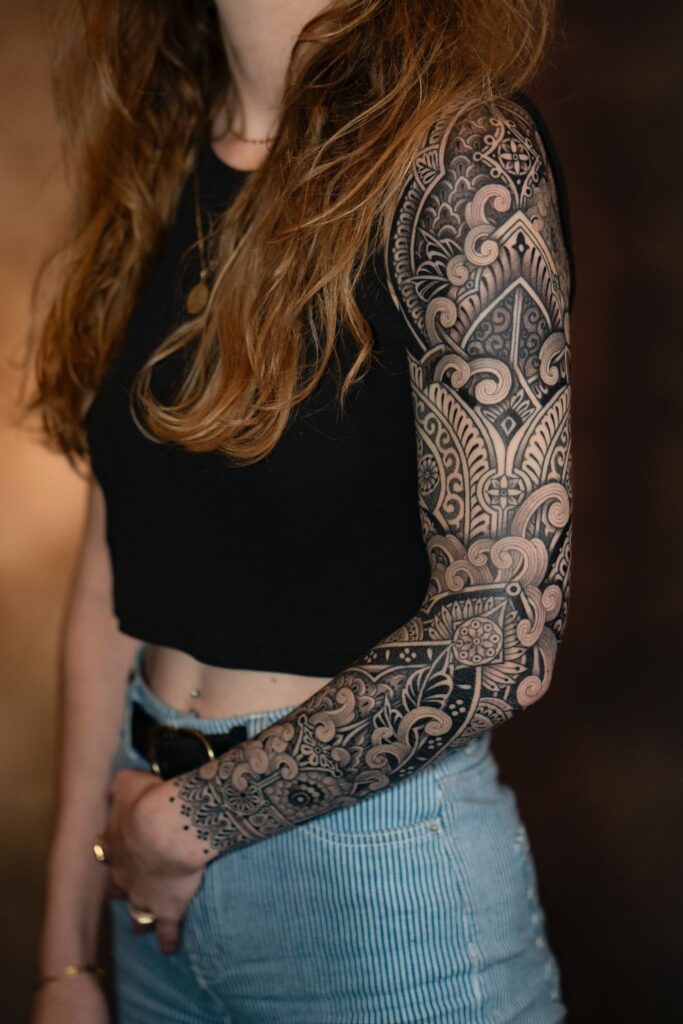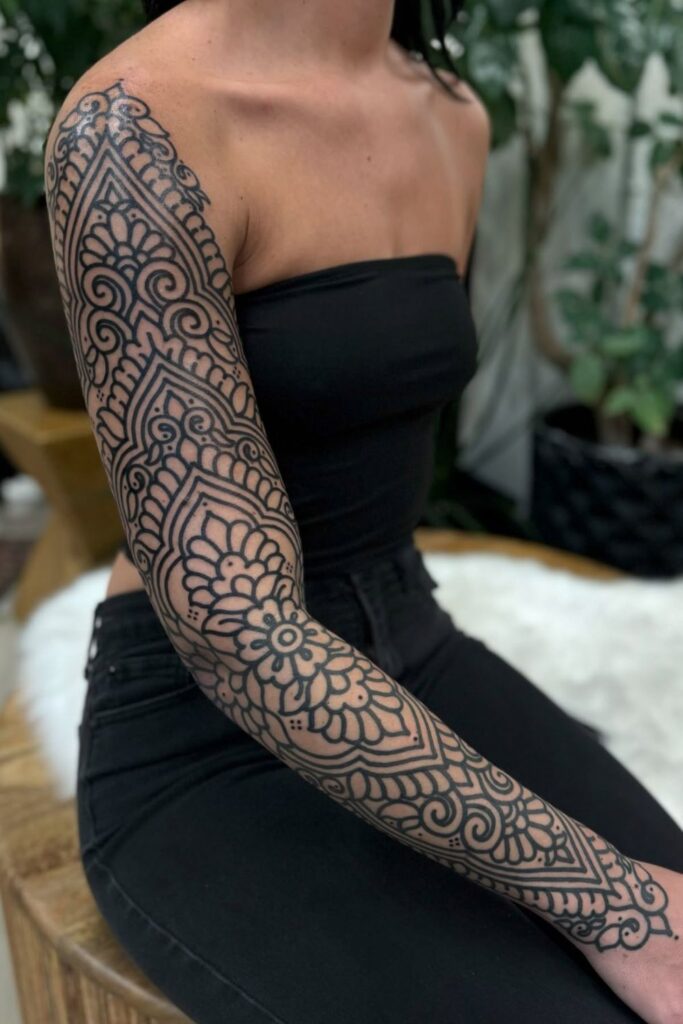 This ornamental sleeve tattoo by “dino_vallely” is a masterpiece of geometric patterns and fine line details, creating a structured yet elegant design.