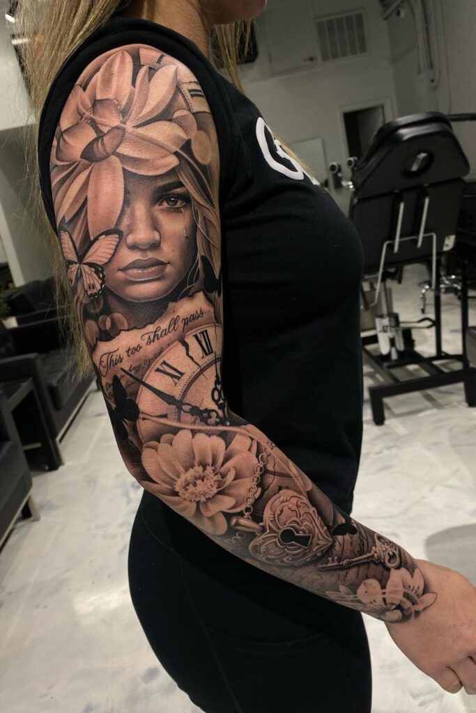 A powerful portrait sleeve tattoo by “jessatattoos” featuring a woman s face surrounded by butterflies, floral accents, a vintage clock, and the phrase “This too shall pass.”