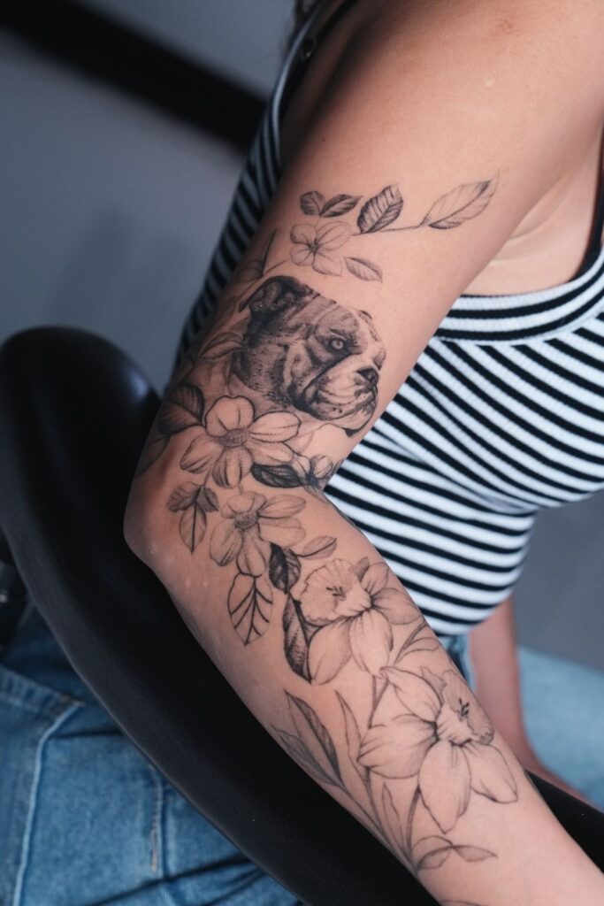 A heartfelt and sentimental tattoo by “d.vancasso.ink“, this sleeve features a beautifully shaded dog portrait surrounded by floral elements, creating a timeless tribute to a beloved pet.