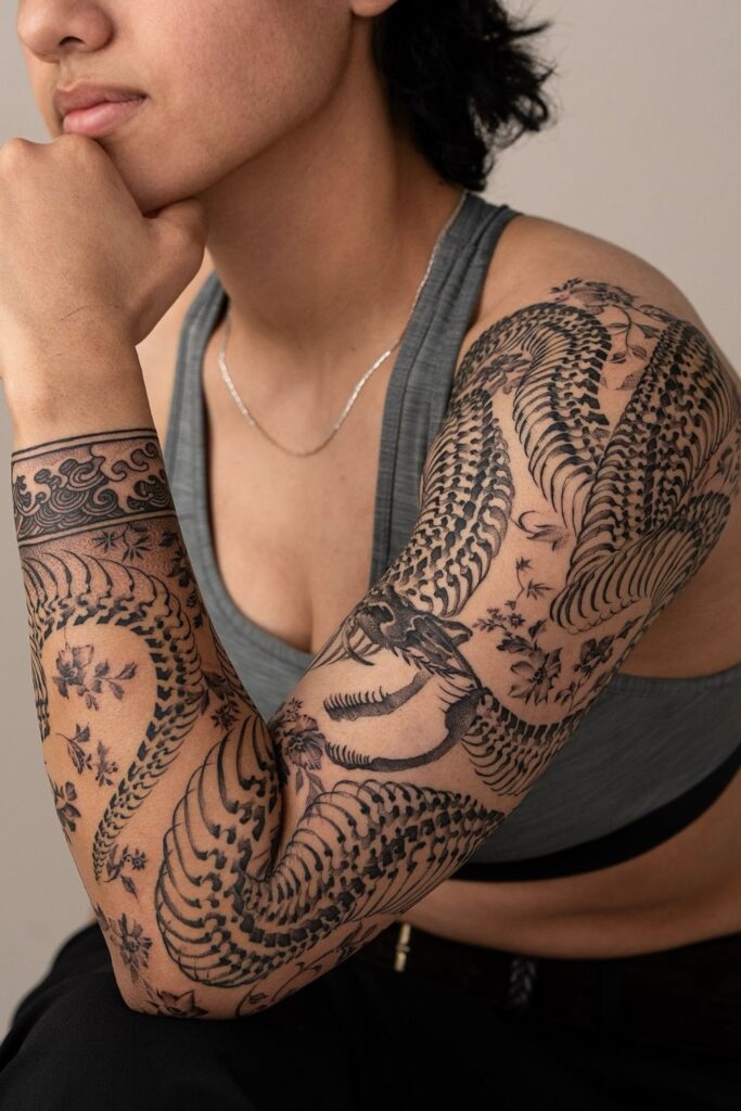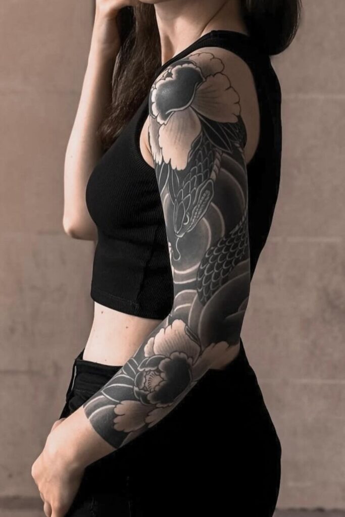 This tattoo is ideal for women who love feminine tattoo sleeves but also want a bold and artistic edge, blending strength with elegance.