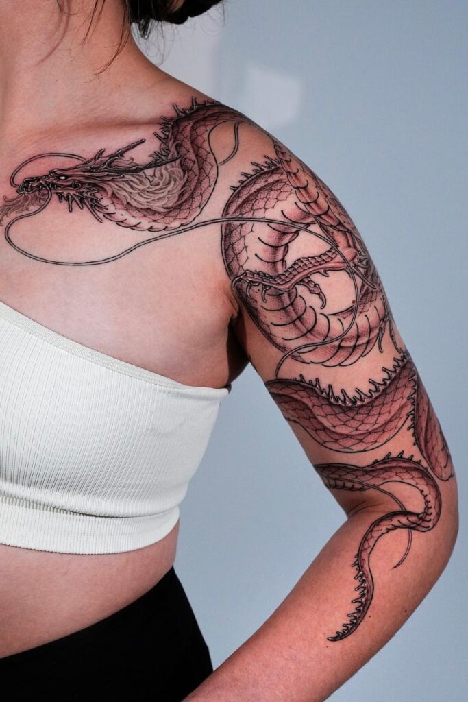 This stunning Japanese-inspired dragon tattoo by “tattooer_intat” wraps around the arm and extends over the shoulder, creating a bold and powerful statement.