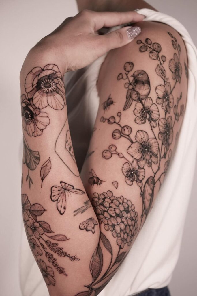 A delicate and highly detailed floral sleeve by “mariafernandeztattoo” featuring birds, bees, and blooming flowers, this tattoo embodies a love for nature, freedom, and harmony.